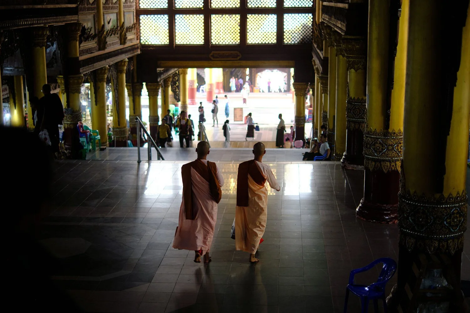Two monks leaving the Shwedagon Pagoda in Yangon
