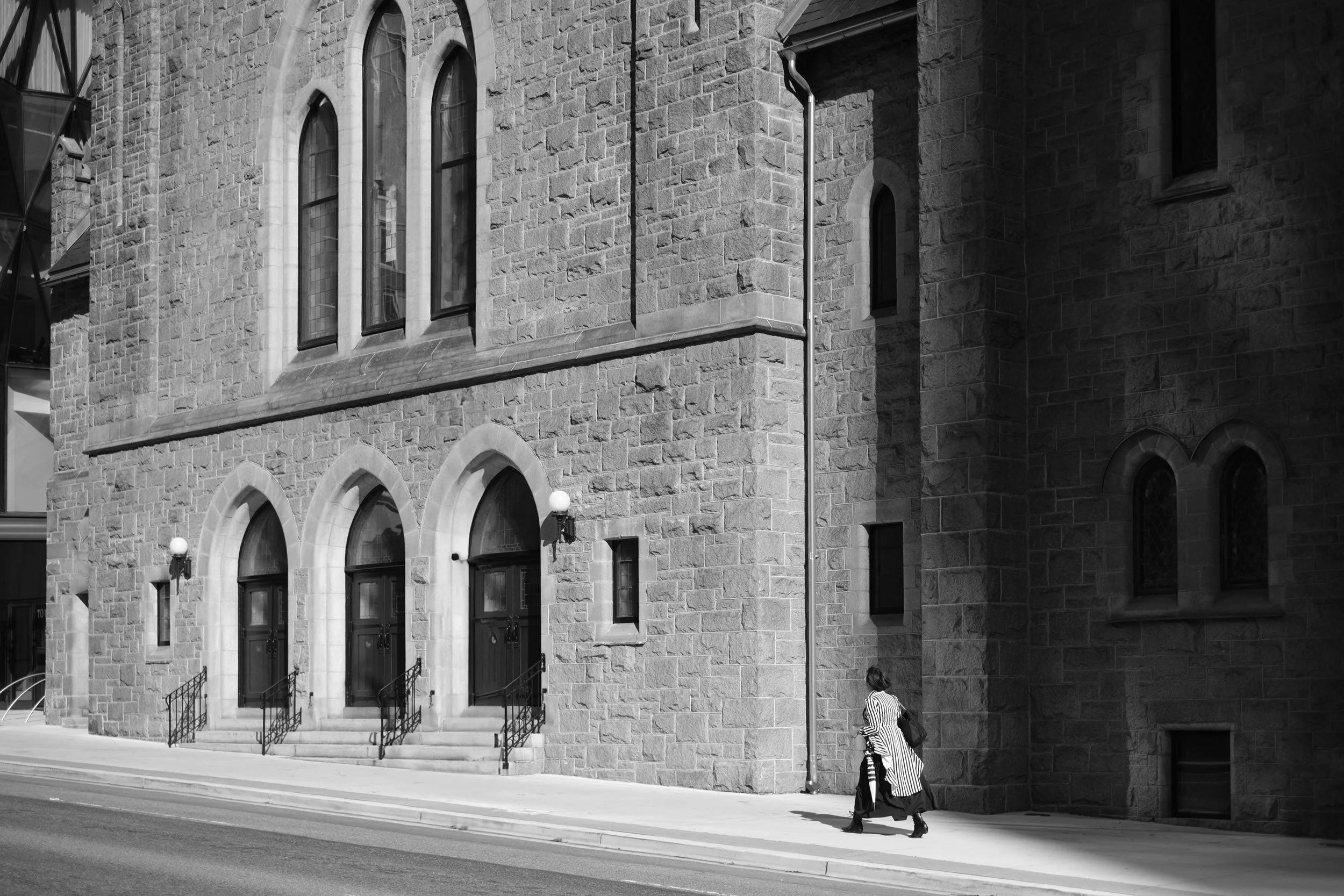 A street scene in the bright October sun along Nelson Street at the First Baptist Church. This one had to be in black and white.